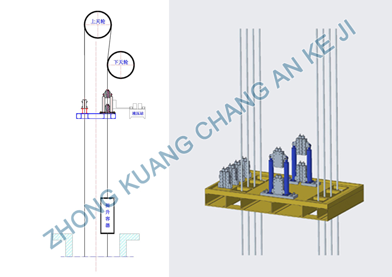 4、采用液压步进提升机构,实现提升绳的连续提升;