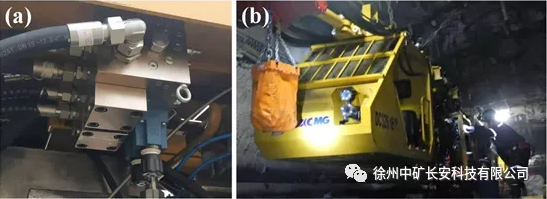 产品实拍:(a)液压超速保护系统核心阀组;(b)应用我司液压超速保护系统的徐工基础DC系列单轨吊产品