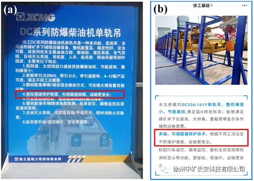 推广宣传:(a)徐工基础DC系列单轨吊产品下线时展板;(b)徐工基础参加太原煤机展时官微宣传