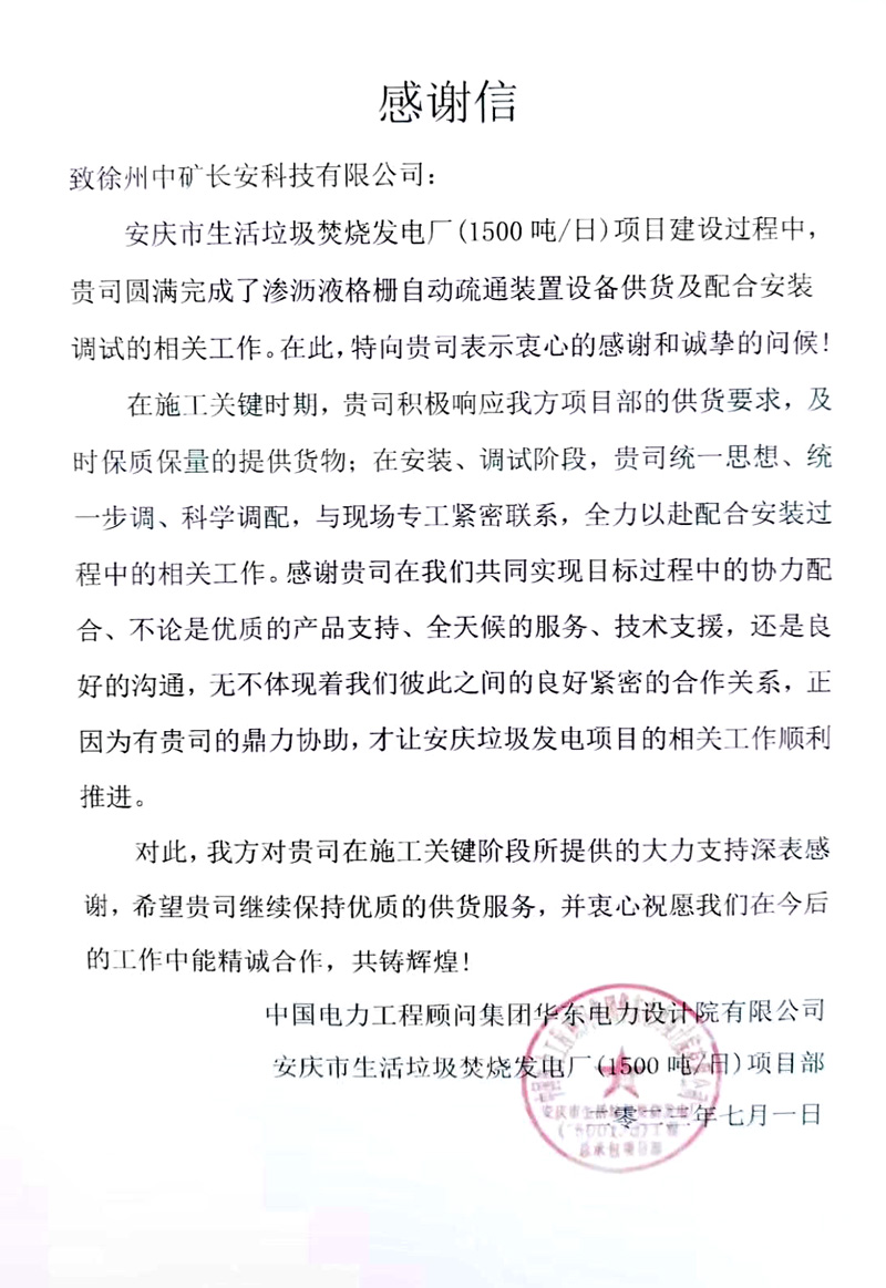 安庆市生活垃圾焚烧发电厂项目致我司感谢信